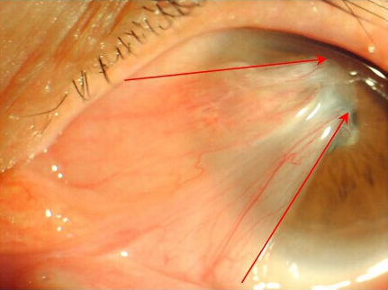 階段二:胬肉長(cháng)到角膜上,眼睛看東西會(huì )出現輕微的模糊。這是因為胬肉會(huì )牽扯角膜,使角膜變形,引起散光。