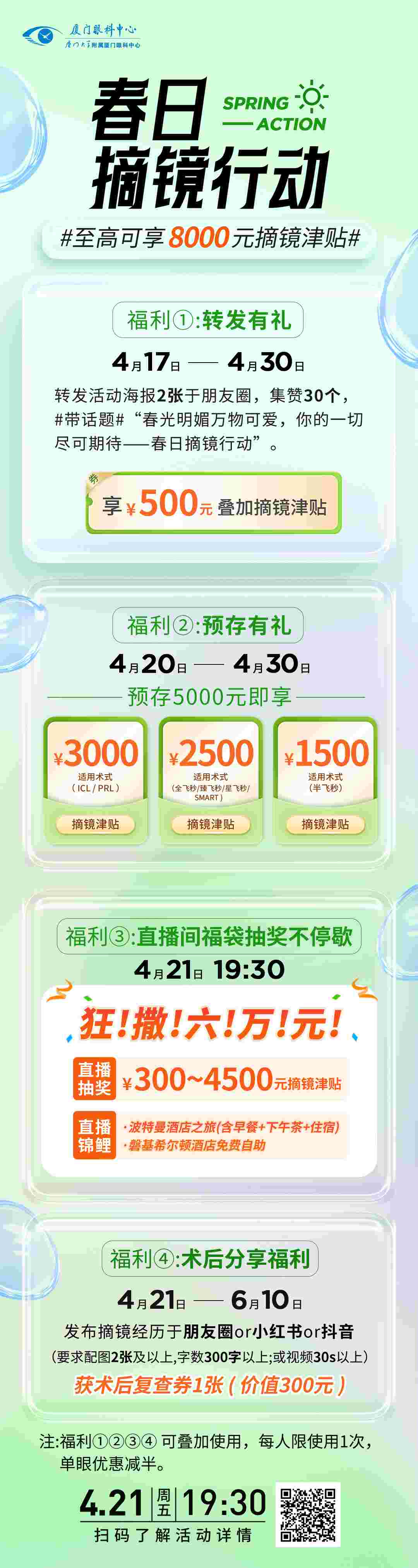 4月20日至4月30日,預存5000元,ICL、PRL享3000元摘鏡津貼;全飛秒/臻飛秒/星飛秒/SMART享2500元摘鏡津貼;半飛秒享1500元摘鏡津貼。
