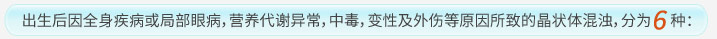 又叫發(fā)育性白內障,多在出生前后即已存在,多為靜止型,可伴有遺傳性疾病,有內生性與外生性?xún)深?lèi),內生性者與胎兒發(fā)育障礙有關(guān),外生性者是母體或胎兒的全身病變對晶狀體造成損害所致。