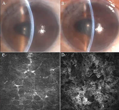 真菌性角膜炎是一種由致病真菌引起的、致盲率極高的感染性角膜病。常見(jiàn)的致病菌為曲霉菌,其次為鐮刀菌、白色念珠菌、頭芽胞菌及鏈絲菌等??沙霈F免疫環(huán)、衛星灶、偽足、菌絲苔被、前方積膿及內皮斑。