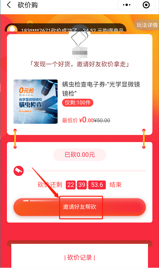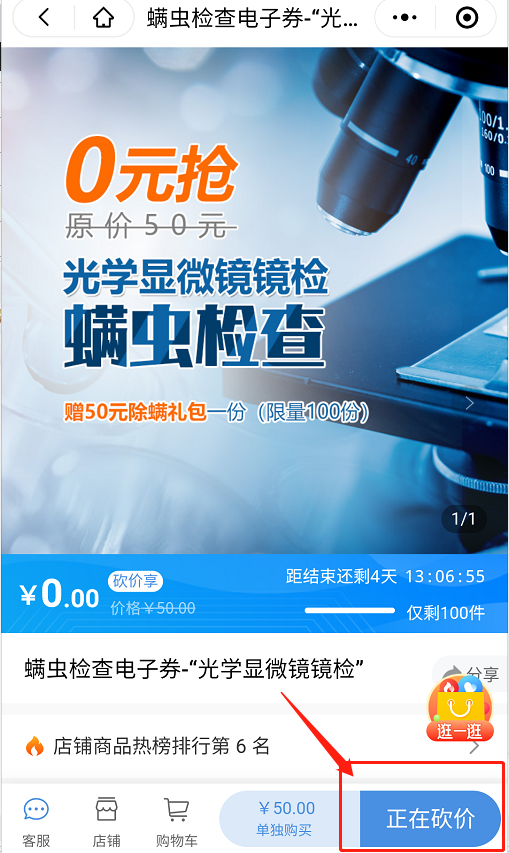 2、邀請10人助力砍價(jià),可0元購螨蟲(chóng)鏡檢