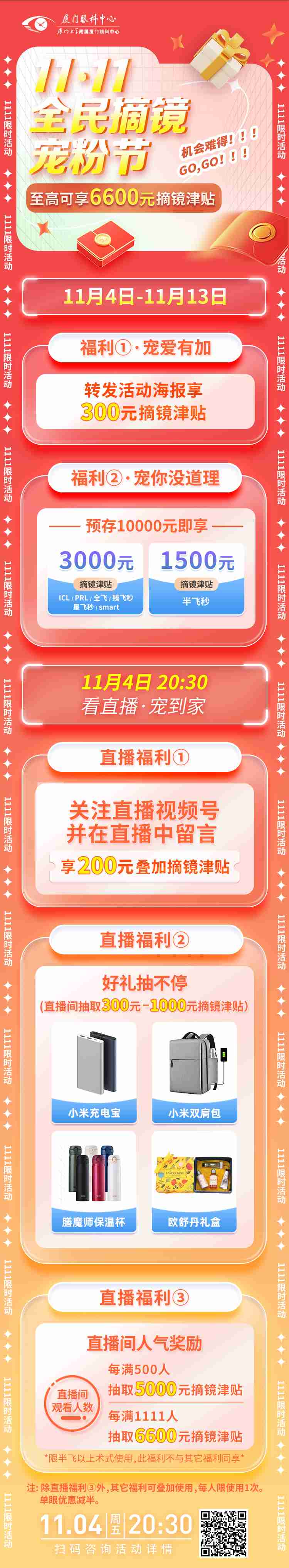 ③(錦鯉獎)直播間觀(guān)看人數每滿(mǎn) 500 人 ,抽取 5000 元摘鏡優(yōu)惠 1 人; 直播間觀(guān)看人數每滿(mǎn)1111 人 ,抽取 6600 元摘鏡優(yōu)惠 1 人 。