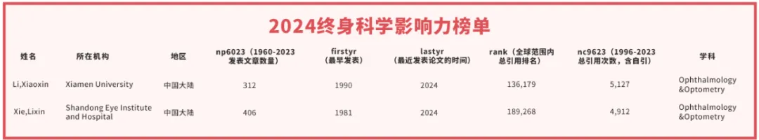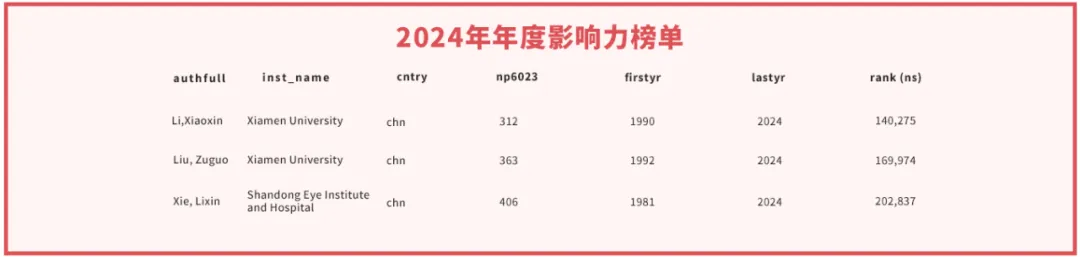 近日,美國斯坦福大學(xué)發(fā)布了第七版《全球前2%頂尖科學(xué)家榜單2024》。國際眼科科學(xué)院院士、廈門(mén)眼科中心總院長(cháng)黎曉新教授、廈門(mén)眼科中心院士工作站導師中國工程院院士謝立信教授入選“終身科學(xué)影響力榜單”,同時(shí)與廈門(mén)眼科中心名譽(yù)院長(cháng)劉祖國教授,三人共同入圍全球“2024年度影響力榜單”!
